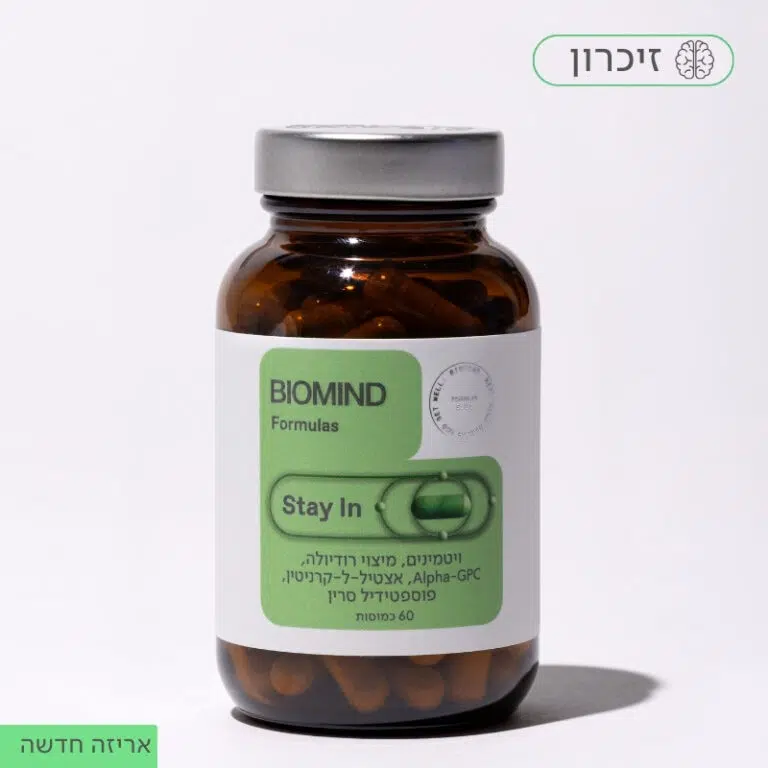 Stay In, פורמולה חדשנית ומקיפה המכילה 7 רכיבים שנחקרו בהקשר לזיכרון ושיפור הבריאות הקוגניטיבית.